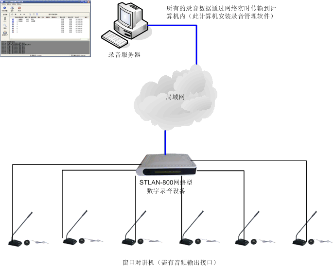 以銀行為例,銀行窗口都裝有雙向?qū)χv機(jī),如果窗口對(duì)講機(jī)留有音頻輸出接口(可以輸出經(jīng)過前置放大的音頻),我們可以連接此設(shè)備,獲取音頻信號(hào)送給STLAN錄音設(shè)備。錄音設(shè)備將模擬信號(hào)音轉(zhuǎn)成數(shù)字信號(hào),實(shí)時(shí)通過網(wǎng)絡(luò)傳至錄音服務(wù)器,進(jìn)行永久保存,可以隨時(shí)查詢調(diào)用。