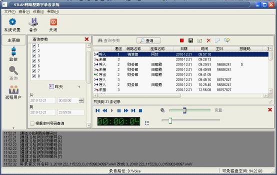 將電話線、網(wǎng)線、電源全部接好后,開啟錄音服務(wù)器端的軟件,保持網(wǎng)絡(luò)暢通,STLAN網(wǎng)絡(luò)型數(shù)字錄設(shè)備就可以獨(dú)立工作了。