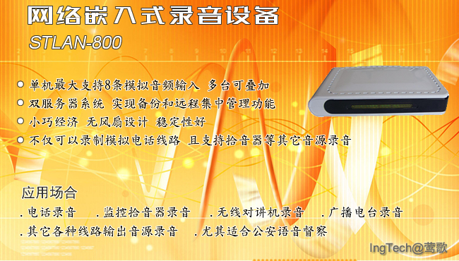 對于傳統(tǒng)錄音設(shè)備而言,STLan具有革命性的意義,它采用嵌入式系統(tǒng),DSP高速處理技術(shù),成功地脫離于計算機。實現(xiàn)了分散錄音、集中管理的典范。不再受限于計算機的硬件,利用強大的網(wǎng)絡(luò)連接能力及采用兼容標(biāo)準(zhǔn)語音編碼格式等特點,通過網(wǎng)絡(luò)實時傳輸數(shù)據(jù)。使得錄音、查詢、播放不再局限于本地。