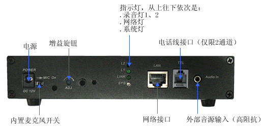 基于它嵌入式的運(yùn)行方案,使得它能靈活適用除電話線路以外的多種模擬信號(hào)音的錄制,諸如調(diào)音臺(tái)、功放、對(duì)講機(jī)、無線電臺(tái)、拾音器等等。