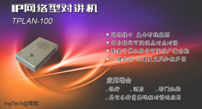 IP對講終端TPLAN-100是一款采用了ARM+DSP架構(gòu),接收網(wǎng)絡(luò)音頻流,實(shí)時(shí)解碼播放;配置了麥克風(fēng)輸入和揚(yáng)聲器輸出,作為網(wǎng)絡(luò)數(shù)字廣播的播放終端。主要用于銀行、部門機(jī)構(gòu)、酒店等場所的網(wǎng)絡(luò)廣播、網(wǎng)絡(luò)對講。